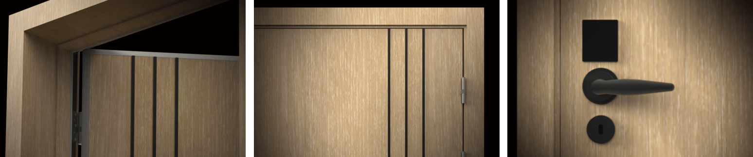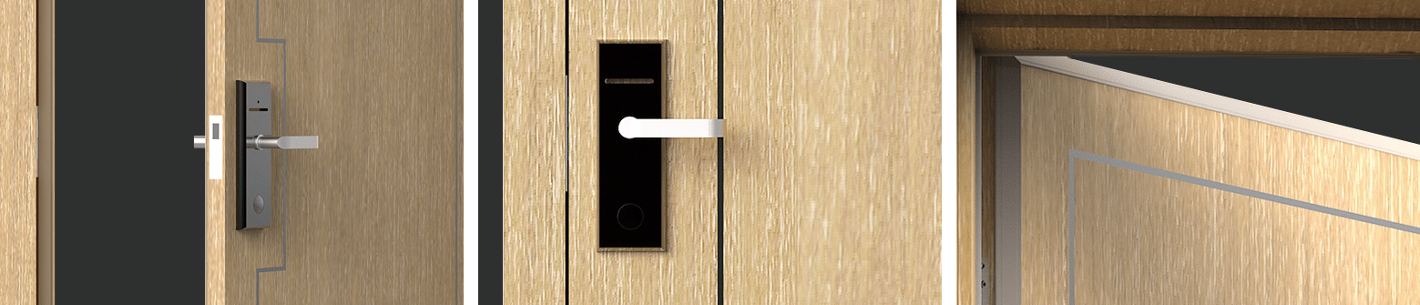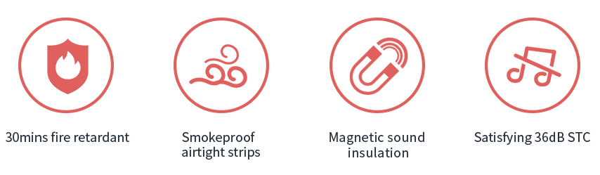 Germany imported fire-resistant and sound insulation core board, Germany thermal expansion smokeproof airtight strip, and Germany original automatic soundproof latch, all these components ensure excellent performance on smoke/flame retardant, as well sound insulation performance, so your star hotels can use it confidently.