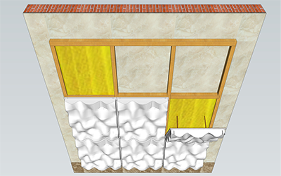 As for wood frame for the wall, it is supposed to adopt wooden one which is bigger than 40x60mm, keeping 600*600mm distance between keel’s center, filling 48kg/m3 rock wool backside cavity, with EVA damping rubber on the bottom and 8pcs self-tapping screw to fix it for each panel from the center to all around .