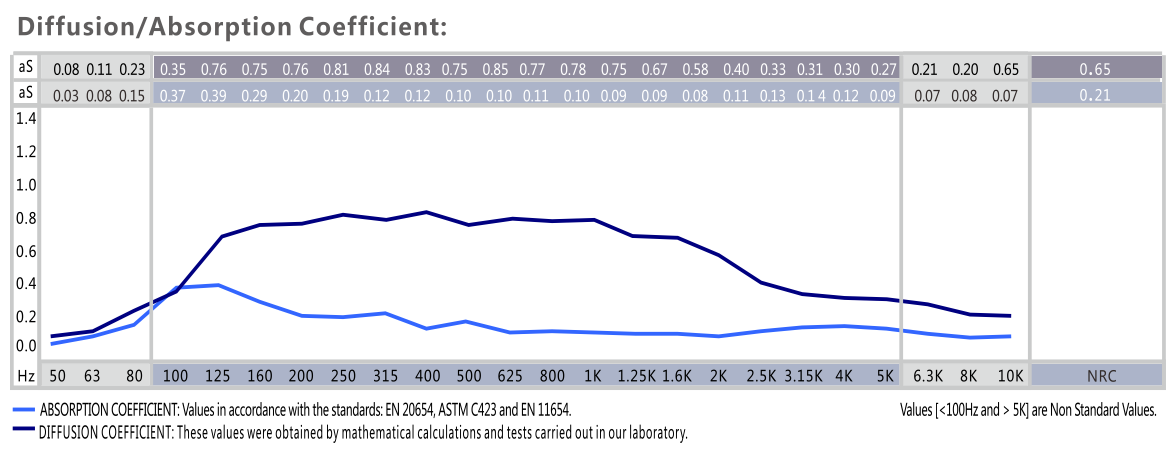 PEAK5Q convex diffuser redistributes the reflected sound energy. Though the re-orientation is not totally taken as the theoretical value for diffusion, the convex shape provides its good acoustic control performance to distribute sound more evenly. The 180° high-efficiency radiation surfaces help to deal with the defect of acoustic shadow in the sound amplification system, which is difficult to be covered.