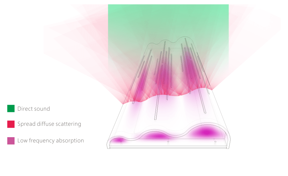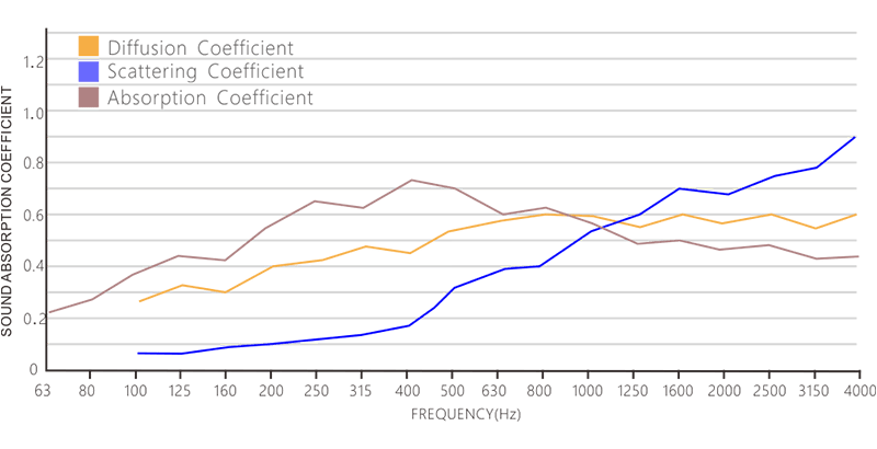 The curve diffusing surface is superimposed onto three octaves, with 20% different slot for absorbing broadband frequency. Three low-frequency cavities in different volume are set inside, filled with green acoustic material to absorb margin low frequency from 250-550 Hz.