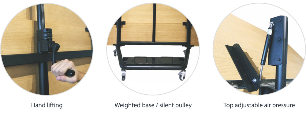Outstanding sound reflection performance, height adjustable, movable for different functions and performances, light honeycomb panel based, Eco-friendly.