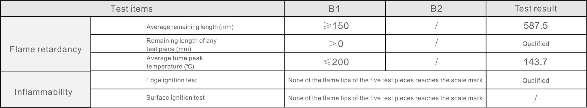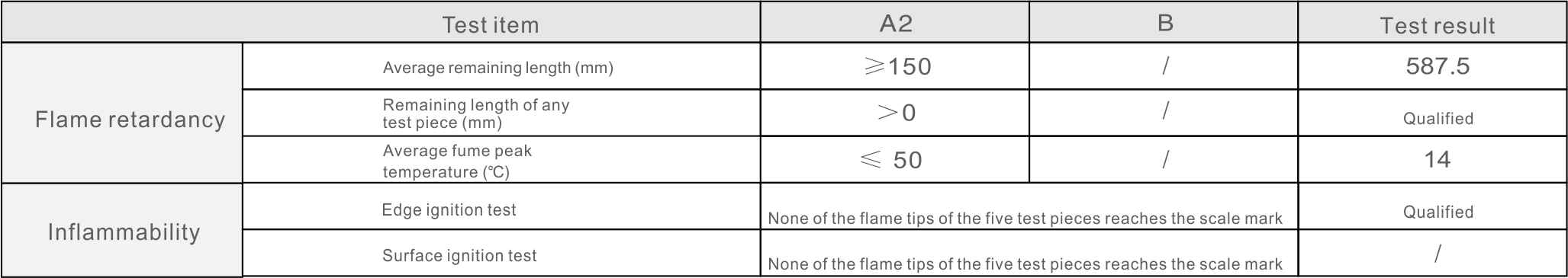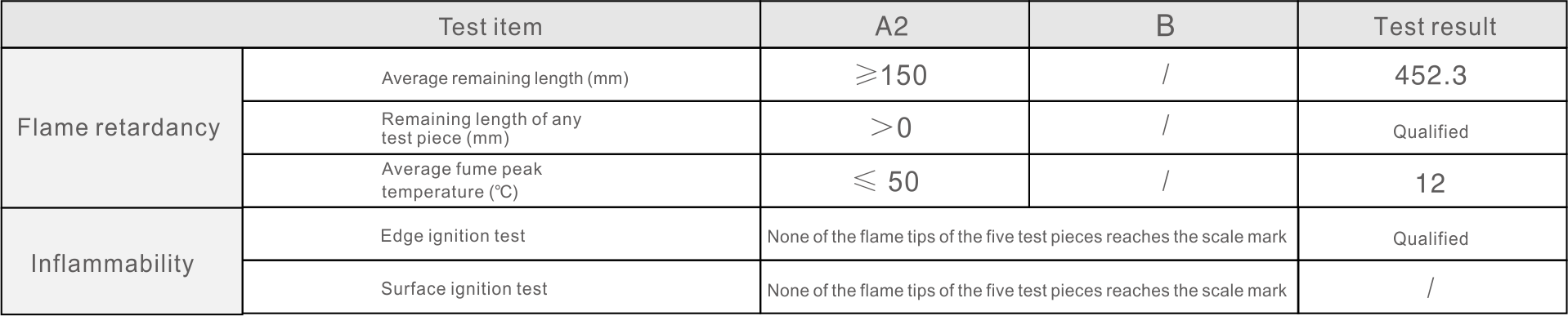 The fireproof inspection results meet the requirements of A2 in GB 8624-2006 and can be directly used for indoor fire prevention.