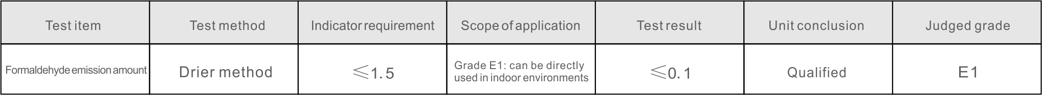 The standard requirement for formaldehyde emission is 1.5mg/L, while the test result is <0.1mg/L, meeting requirement of El in the national standard GB18580-2001, and thus can be directly used for indoor decoration.