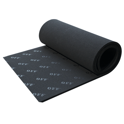 OFF Vibration Damping and Sound Insulation Mat using Eco-friendly SBR/PU GLUE as the base material. The SBR foam molding microcavity flexible material has a superior physical advantage of the memorial resilience and strong adhesion, and it’s broadband damping capacity will help with transmission loss. When it fully covering the floor area, stress evenly applied thus ensured tremendous surface support, which can absorb ground impact noise and cut off the transmission bridge on wooden and tile flooring applications. Its water-resistant material will not affect the service life due to the degradation of the humid environment, or mildew, corrosion, and there is no harmful gas emissions, highly green environmental protection.